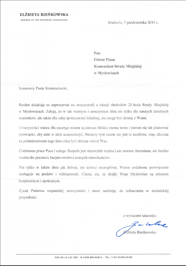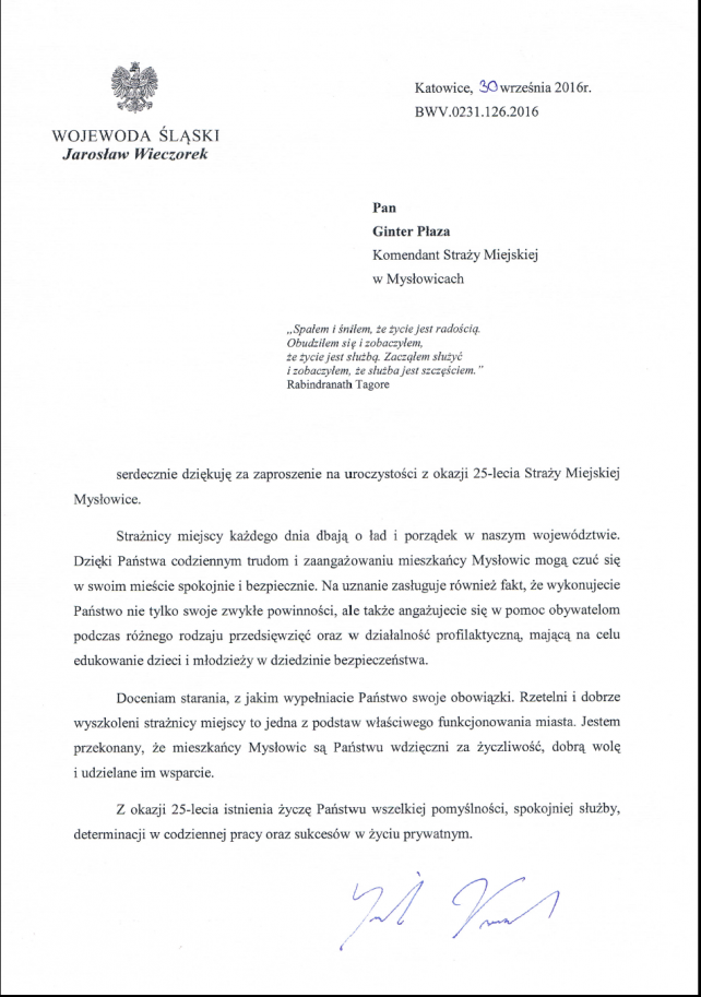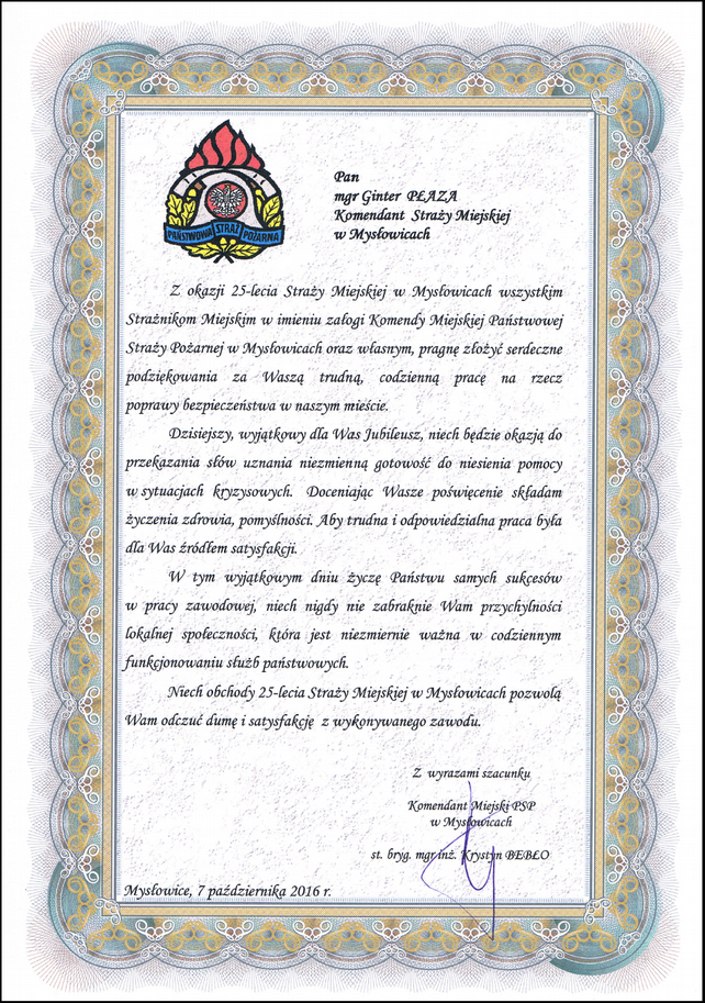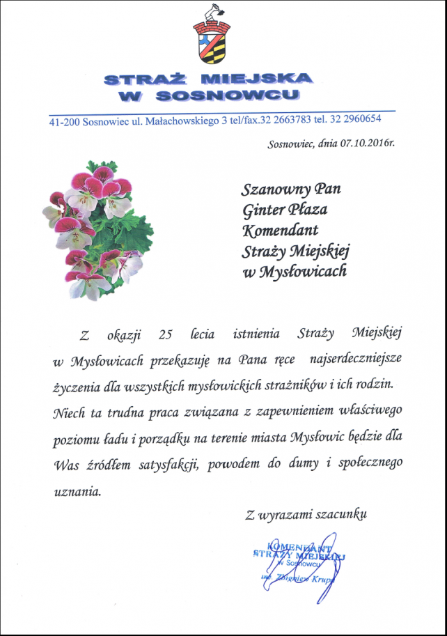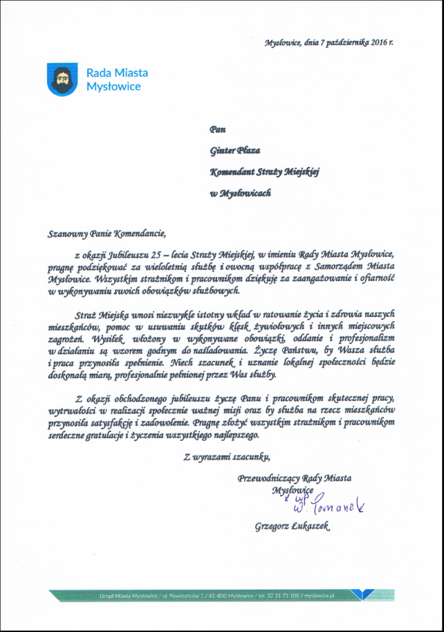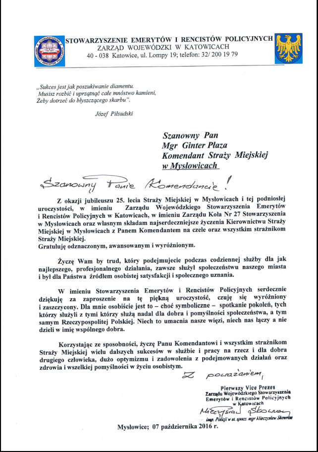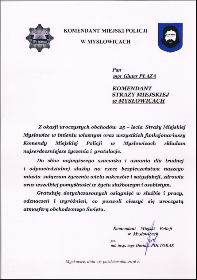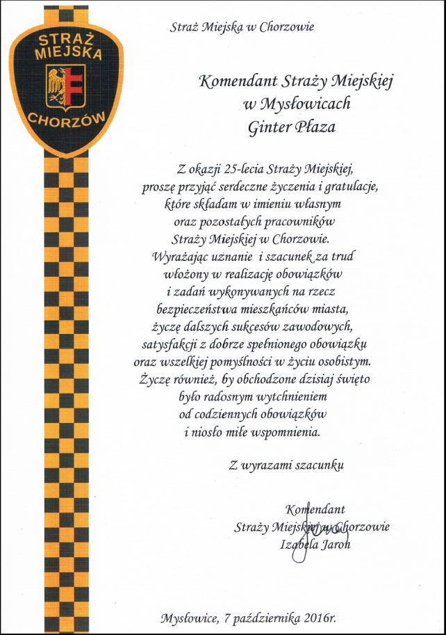W trakcie trwania obchodu 25 rocznicy utworzenia Straży Miejskiej w Mysłowicach, które odbyły się w dniu 07.10.2016 r. w sali kinowej Mysłowickiego Ośrodka Kultury, na ręce Komendanta Gintera Płazy wpłynęło wiele listów gratulacyjnych i pamiątkowych.