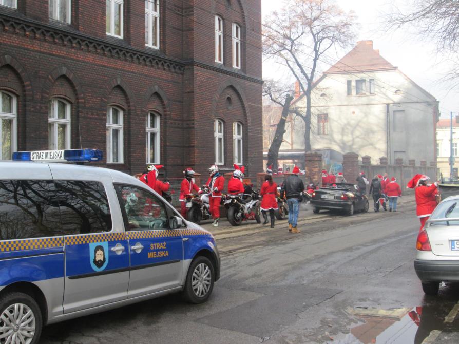 Grupa na motocyklach w przebraniu Mikołajów przejechała przez miasto w w asyscie Straży Miejskiej która po raz kolejny mogła pomagac w zabezpieczeniu tej charytatywnej imprezy . Darczyńcy odwiedzili 3 Ośrodki Wychowawcze dla dzieci i młodzieży w Mysłowicach, które zostały obdarowane słodyczami i zabawkami.Mamy satysfakcje i powody do zadowolenia że kolejny raz możemy uczestniczyć w imprezie o tak szczytnym celu.
