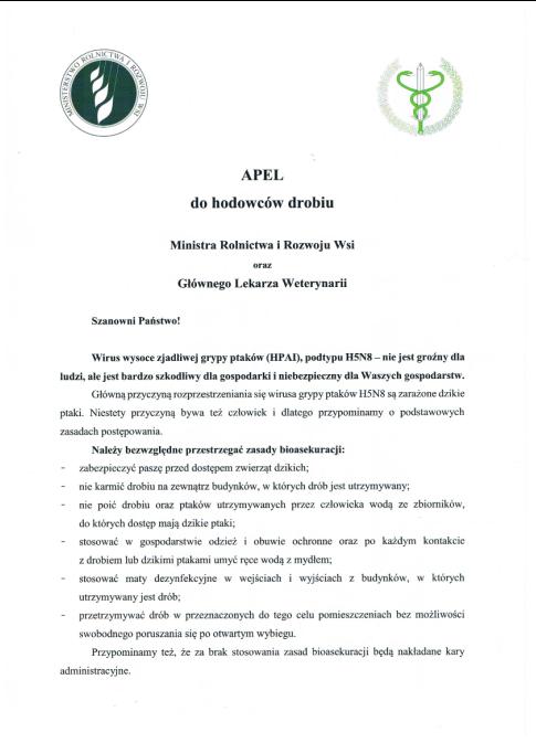 Poniżej tekst apelu wystosowanego do hodowców drobiu przez Ministra Rolnictwa i Rozwoju Wsi.