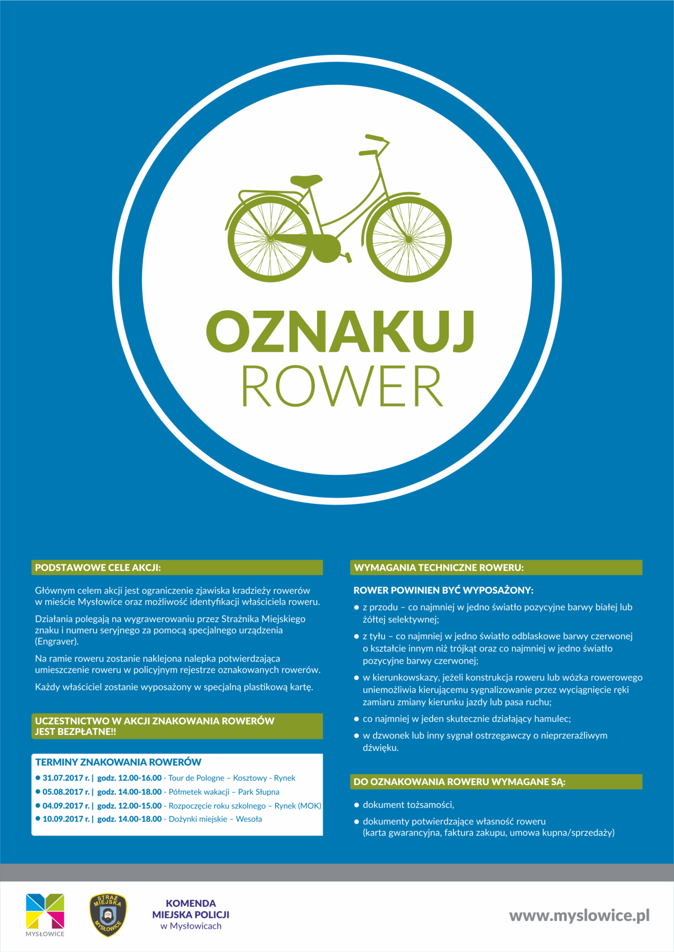W dniu 31 lipca 2017 r. mieszkańcy Mysłowic będą mogli po raz pierwszy bezpłatnie oznakować swoje rowery, by zabezpieczyć je w ten sposób przed złodziejami.