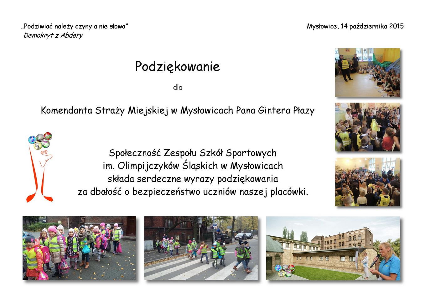 W dniu 16 listopada naszą jednostkę odwiedziły dzieci z Zespołu Szkół Sportowych im. Olimpijczyków Śląskich w Mysłowicach. Wizyta ta wywołała wiele zainteresowania w oczach dzieci, co było widać po ich twarzach. Dzieci podziękowały za otrzymane kamizelki odblaskowe i dbanie o ich bezpieczeństwo. Miłą niespodzianką było ofiarowane na ręce komendanta pamiątkowe zdjęcia. Odwiedzający uczniowie otrzymali pamiątkowe opaski odblaskowe aby zawsze być widocznym przez kierowców, mieli możliwość również zobaczyć jak wygląda praca straży miejskiej.