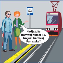- na przystanku zapytaj niewidomego oczekującego na tramwaj lub autobus o numer linii, na którą czeka i poinformuj go, gdy podjedzie właściwy pojazd.